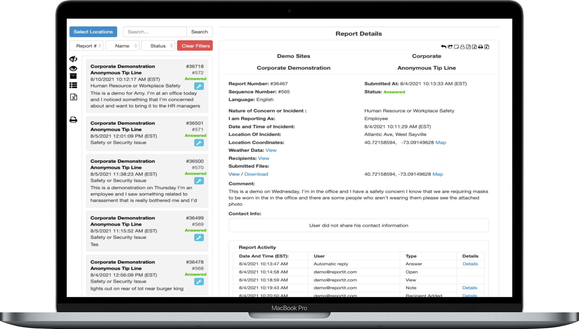 With over 20 years of experience in providing world-class reporting solutions, report It® can help you increase the safety, security and communication within your workforce. report it® partners with Amazon Web Services (AWS) to make sure your data is always safely and secure stored in redundant and encrypted servers and available 24/7/365 from anywhere.